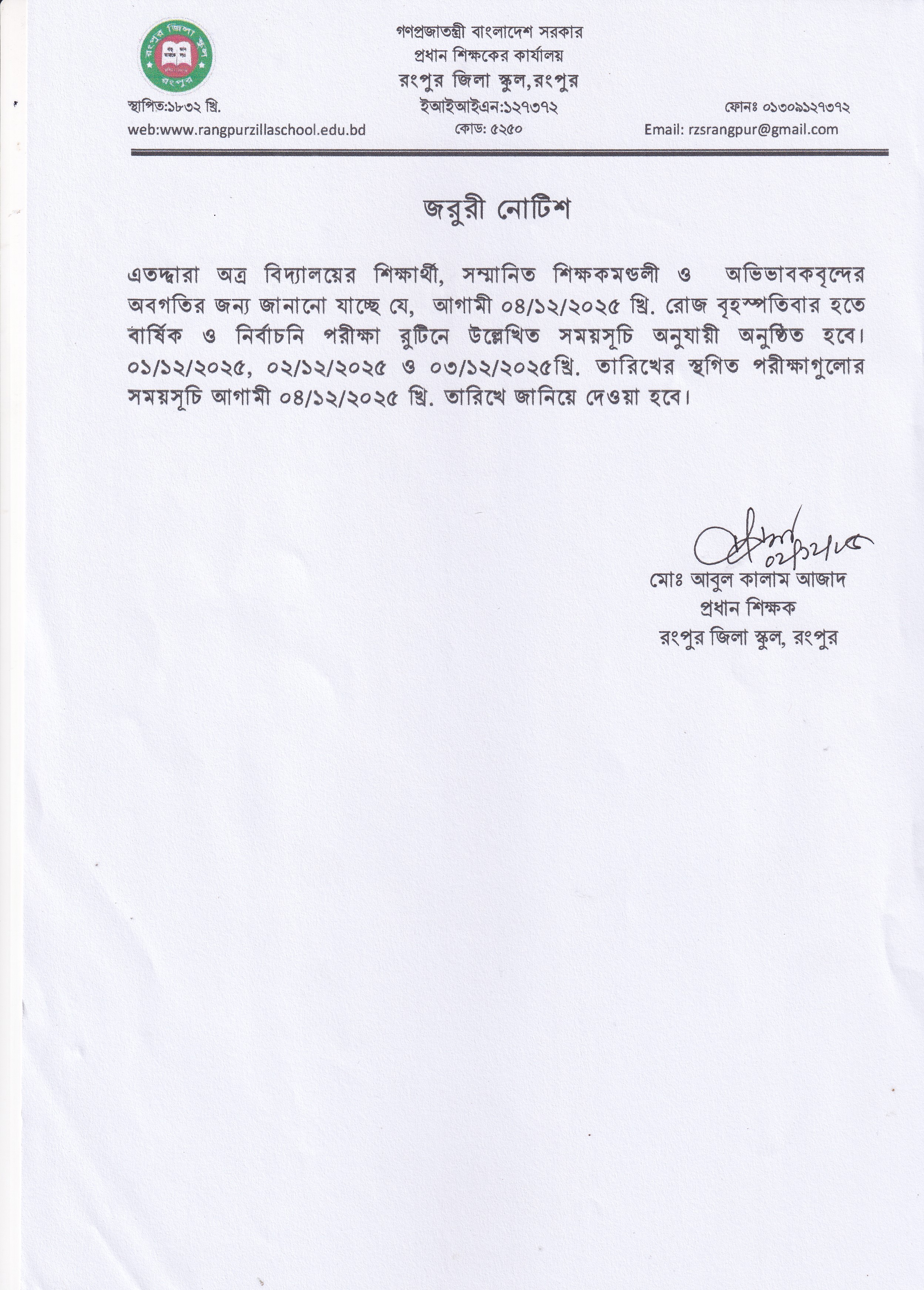 এতদ্দ্বারা অত্র বিদ্যালয়ের শিক্ষার্থী, সম্মানিত শিক্ষকমণ্ডলী ও অভিভাবকবৃন্দের অবগতির জন্য জানানো যাচ্ছে যে, আগামী ০৪/১২/২০২৫ খ্রি. রোজ বৃহস্পতিবার হতে বার্ষিক ও নির্বাচনি পরীক্ষা রুটিনে উল্লেখিত সময়সূচি অনুযায়ী অনুষ্ঠিত হবে। ০১/১২/২০২৫, ০২/১২/২০২৫ ও ০৩/১২/২০২৫খ্রি. তারিখের স্থগিত পরীক্ষাগুলোর সময়সূচি আগামী ০৪/১২/২০২৫ খ্রি. তারিখে জানিয়ে দেওয়া হবে।